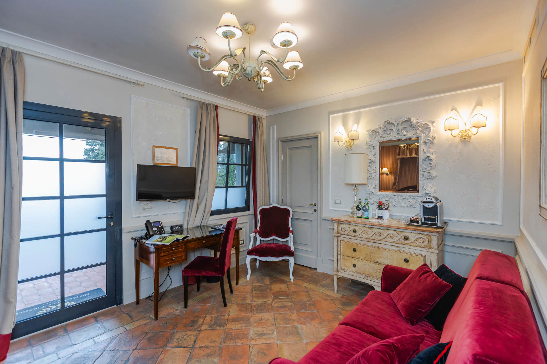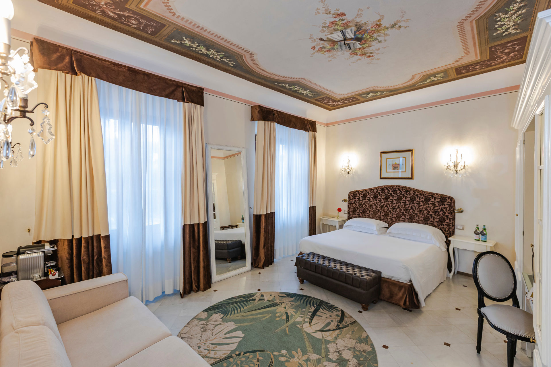 Características: techo con fresco del siglo XIX, terraza panorámica privada con dos sillones, una sombrilla, una tumbona y una tumbona, suelo de mármol