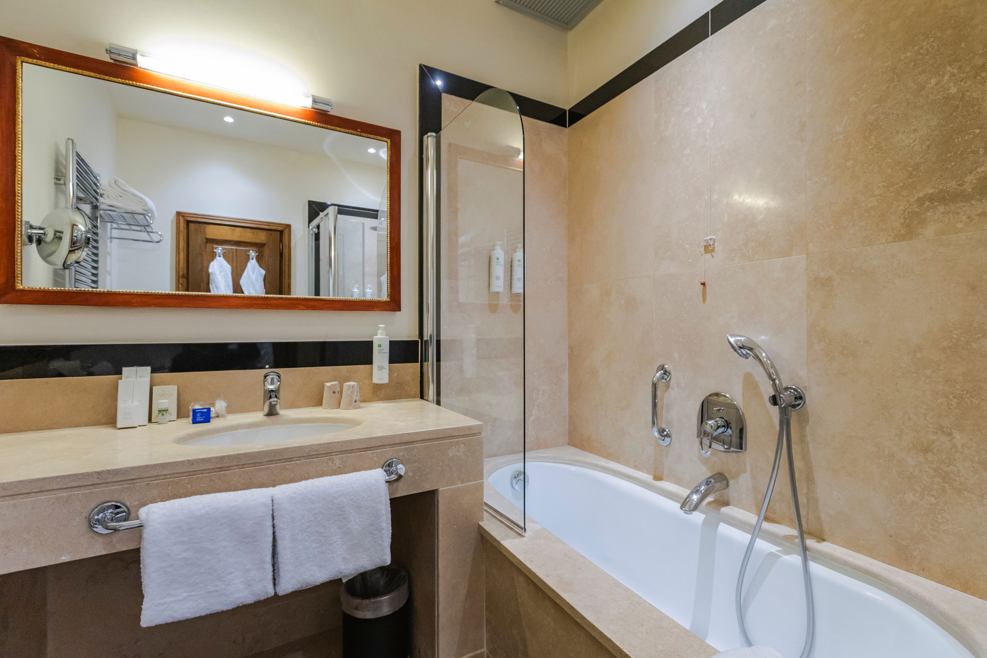 Cuarto de baño: con bañera y panel de ducha integrado