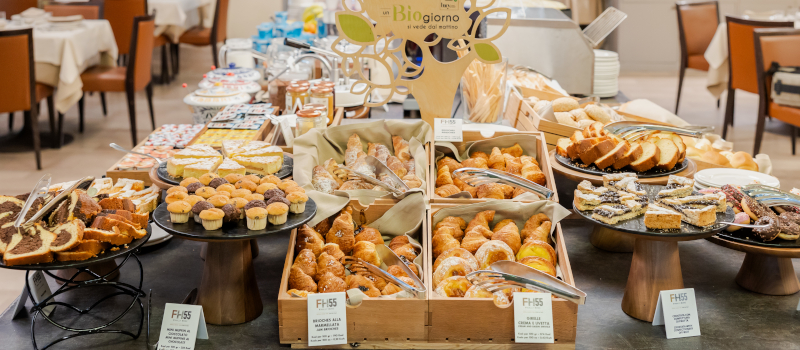 Al mattino colazione con buffet ricco e variegato. Prodotti biologici, integrali, gluten free, a basso contenuto proteico, cereali, frutta, frutta secca, semi, yogurt, miele.